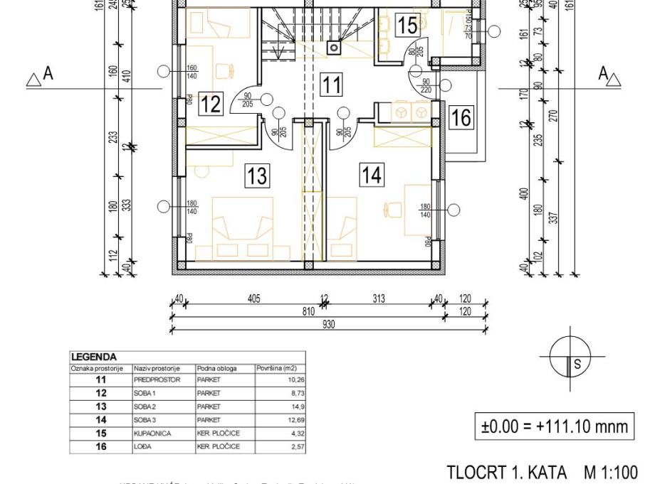 PRIZEMLJE: hodnik, kupaonica, izba, dnevni boravak, kuhinja i spavaća soba.