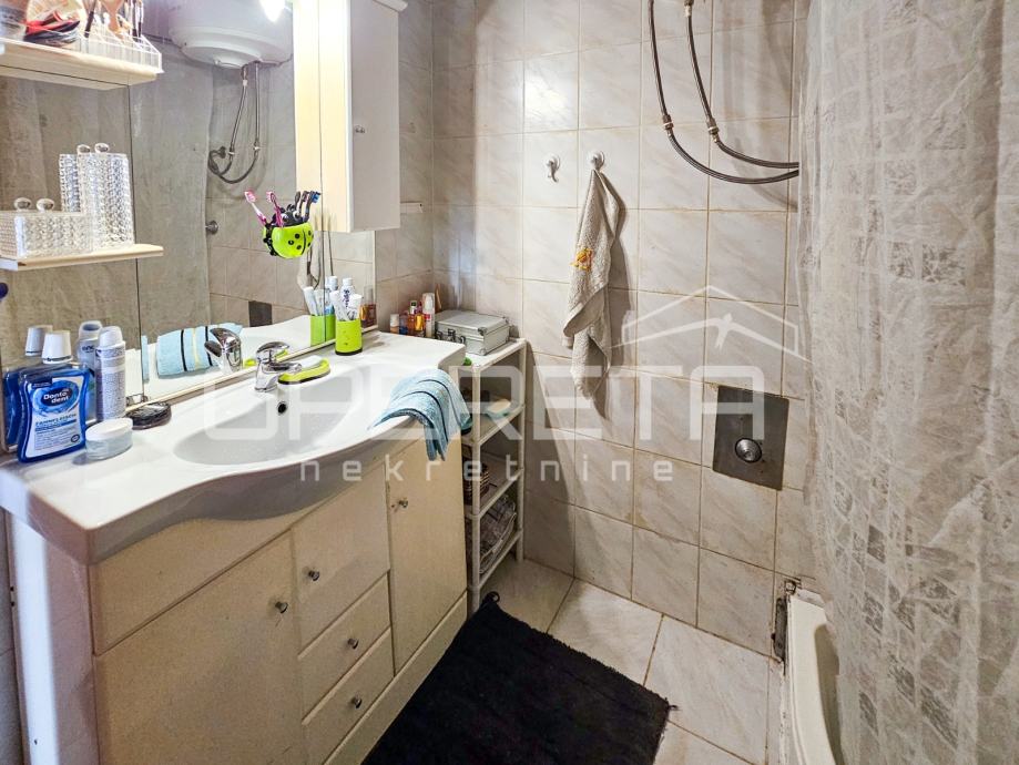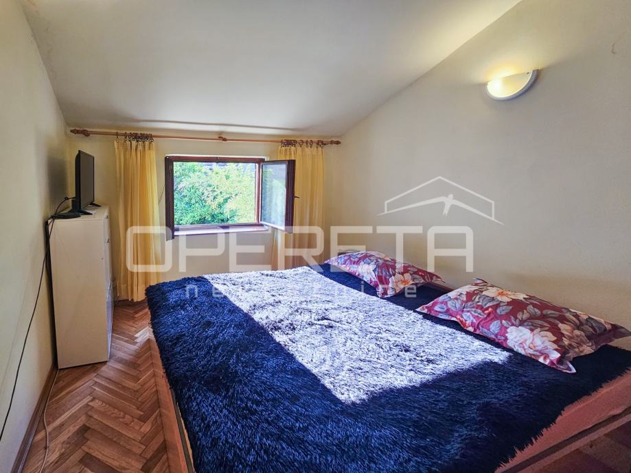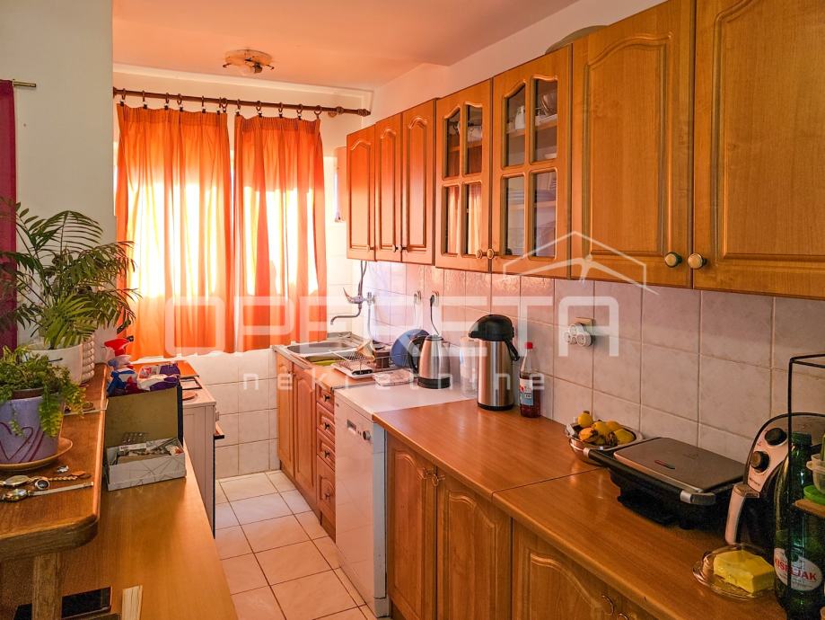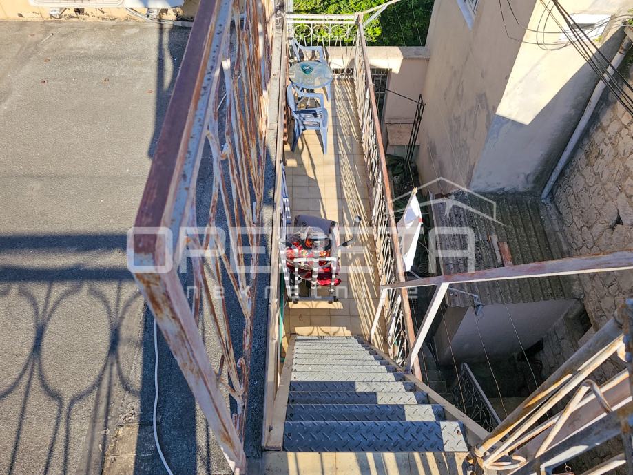 Stan na katu uključuje kuhinju i blagovaonicu, dnevni boravak, dvije spavaće sobe, kupaonicu, zaseban toalet te nenatkriveni balkon. S balkona se vanjskim montažnim željeznim stepenicama pristupa krovnoj terasi s pogledom na gradski kvart, prostoru s potencijalom za ugodnu zonu odmora ili boravak na otvorenom.