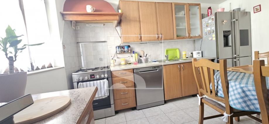 U prizemlju se nalazi ulazni hodnik iz kojeg se pristupa zasebnoj kuhinji te prostranom dnevnom boravku s izlazom na stražnje dvorište. Dvorište površine 135 m² pruža idealan prostor za opuštanje i druženje, a u njemu se nalazi šarmantna konoba od cca 20 m², krušna peć i roštilj.