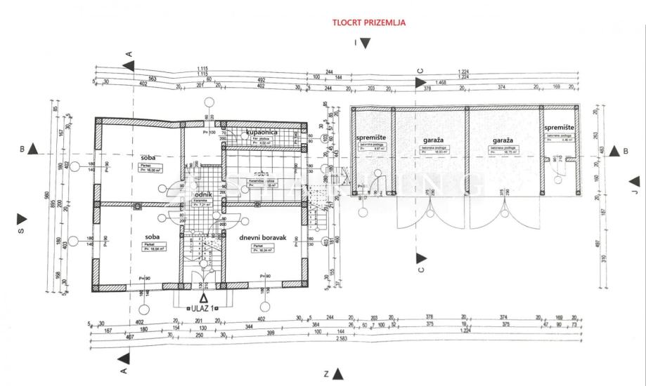PRIZEMLJE: 3-soban stan (dnevni boravak i kuhinja, 2 spavaće sobe i kupaonica) ukupne korisne površine 100 m2.