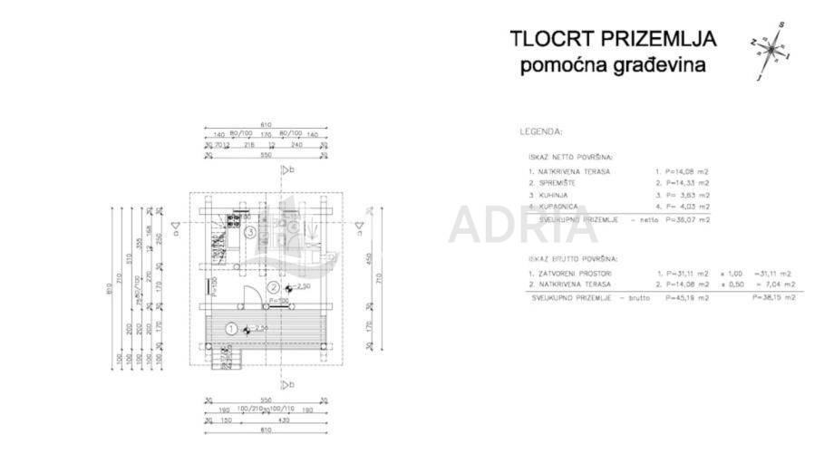 Na terenu je također postavljena betonska ploča za pomoćni objekt ukupne netto površine 36,07 m², s predviđenom kuhinjom, kupaonicom, spremištem i natkrivenom terasom.