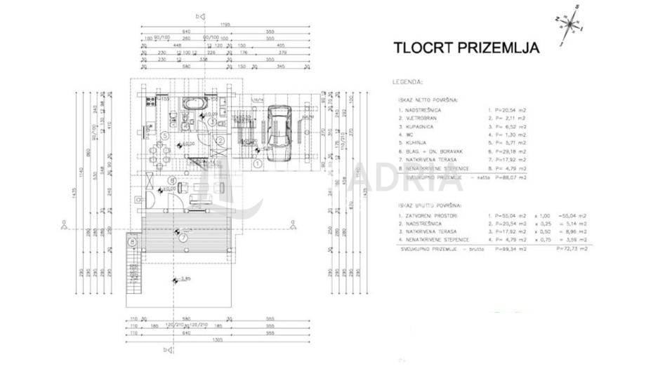 Prizemlje (88,07 m²): natkriveni ulaz preko rustikalne nadstrešnice od trupaca (20,54 m²), vjetrobran, kupaonica, WC, kuhinja, blagovaonica i dnevni boravak s izlazom na natkrivenu terasu s pogledom na šumu.