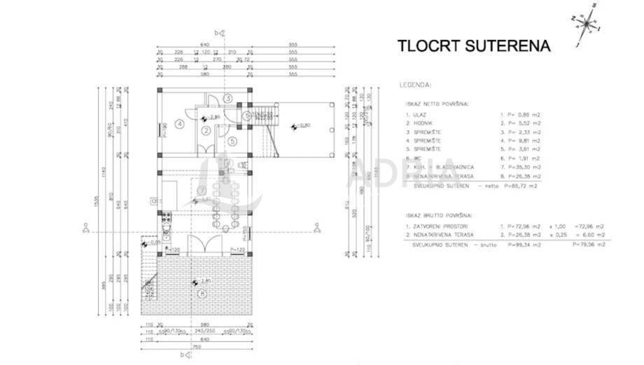 Suteren (59,34 m²): ulazni prostor, hodnik, tri spremišta, WC te kuhinja s blagovaonicom i izlazom na nenatkrivenu terasu (26,38 m²).