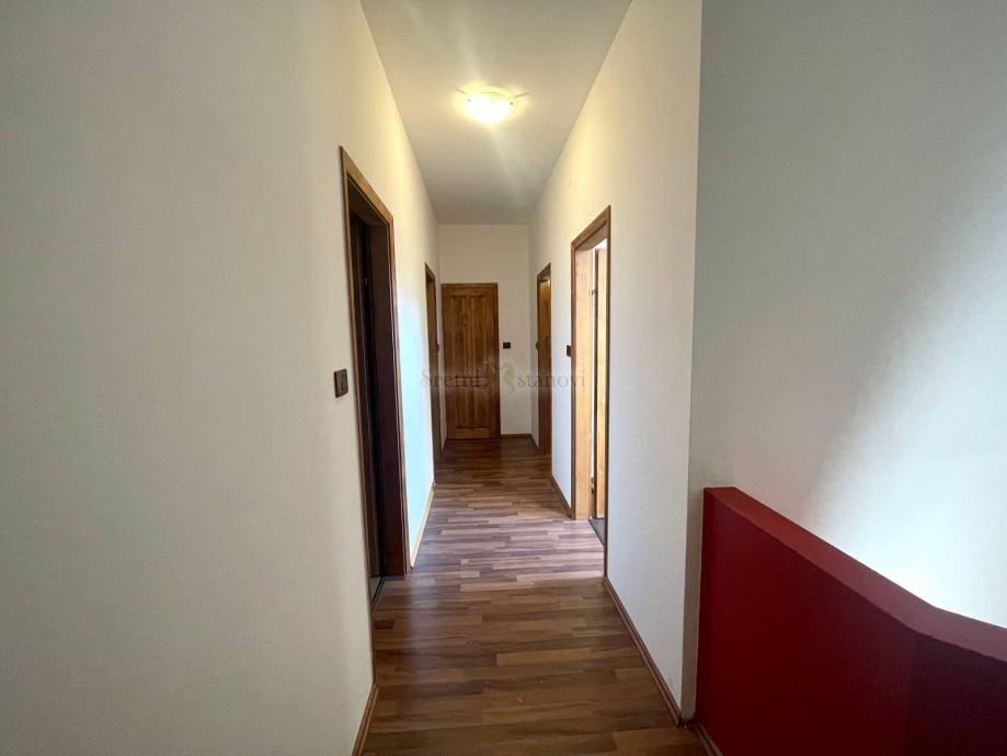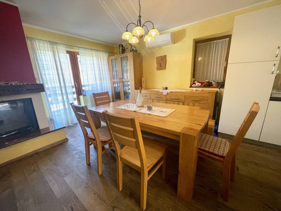 This house in Fužine consists of a ground floor and an upper floor. The ground floor consists of an entrance hall, a toilet room, one bedroom and a spacious, air-conditioned living room with a large fireplace, kitchen and dining area, with access to a large covered terrace. On the upper floor there are three bedrooms, a storage room, a bathroom with underfloor heating and a terrace with a beautiful view on the greenery. House area: aroud 130 m2. Plot area: 385 m2.