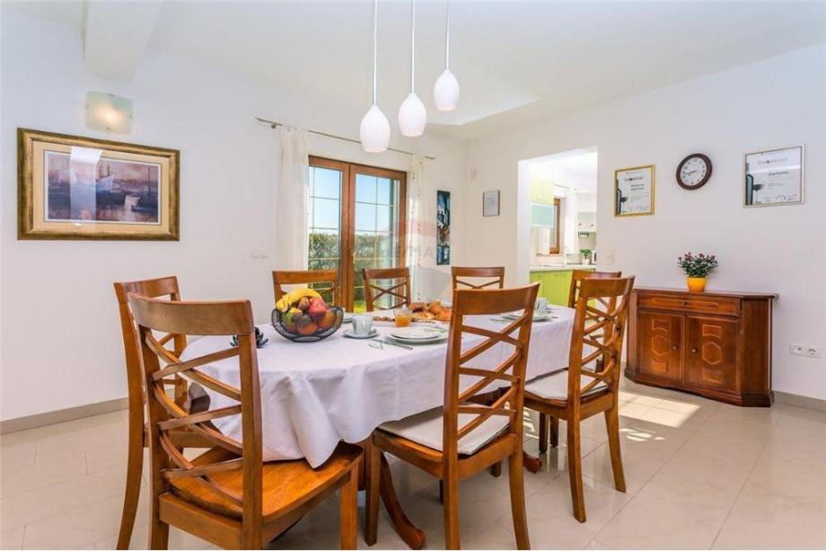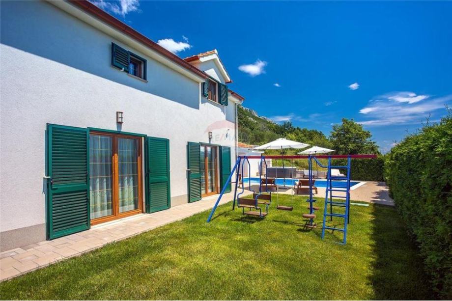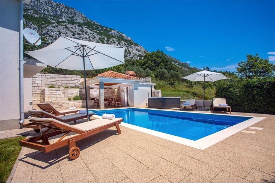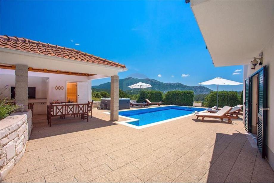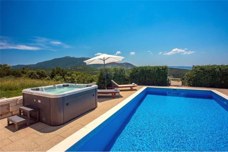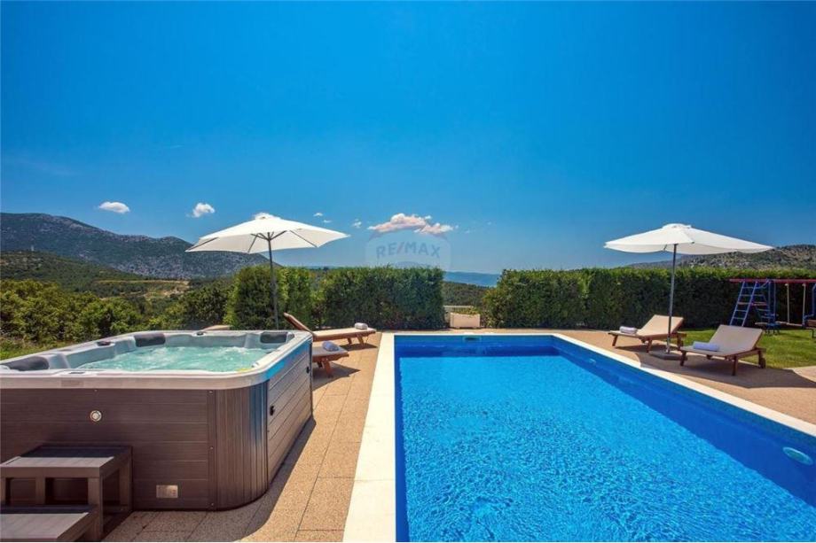 Južne je orijentacije. Uz travnjak i igralište za djecu smješteni su natkriveni roštilj, sauna, grijani bazen od 33m2 te jacuzzi.