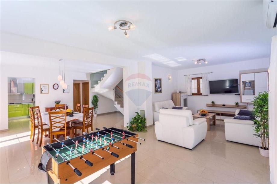 Kuća je klimatizirana: dnevni boravak je klima od 5 kW ,inventar,Multisplit 7,8 kW vanjska jedinica i 3 unutarnje 3x 2.5 kW za tri sobe na katu, Masažna kutna kada 125x125 cm se nalazi u velikoj sobi s kupatilom od 26 m2.