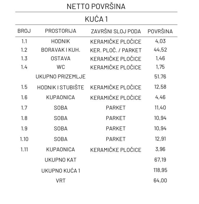 Prodaje se luksuzna kuća u Gornjem gradu. Kuća se sastoji od prizemlja i kata. U prizemlju se nalazi hodnik (4,03m2), dnevni boravak sa blagovaonicom i kuhinjom (44,52m2), ostava (1,46m2) i WC (1,75m2). Ukupne površine prizemlje 51,76m2. Kat se sastoji od hodnika i stubišta (12,58m2), kupaonice (4,46m2), sobe 1 (11,40m2), sobe 2 (10,94m2), sobe 3 (10,94m2), sobe 4 (12,91m2) i kupaonice (3,96m2). Ukupne površine kat 67,19m2. Sveukupne površine 118,95m2. Uz kuću je pripadajuće dvorište površine 64,00m2, spremište površine cca 8m2 i garaža površine 18,85m2. Orijentacije: sjever /jug. Kuća je opremljena PVC stolarijom, el. rolete, podovi - keramika/ parket po izboru kupca, klizne stijene, protuprovalna vrata, klima...Grijanje: podno, centralno-plinsko..