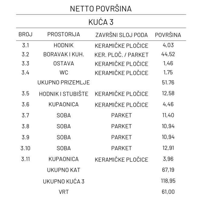 Prodaje se luksuzna kuća u Gornjem gradu. Kuća se sastoji od prizemlja i kata. U prizemlju se nalazi hodnik (4,03m2), dnevni boravak sa blagovaonicom i kuhinjom (44,52m2), ostava (1,46m2) i WC (1,75m2). Ukupne površine prizemlje 51,76m2. Kat se sastoji od hodnika i stubišta (12,58m2), kupaonice (4,46m2), sobe 1 (11,40m2), sobe 2 (10,94m2), sobe 3 (10,94m2), sobe 4 (12,91m2) i kupaonice (3,96m2). Ukupne površine kat 67,19m2. Sveukupne površine 118,95m2. Uz kuću je pripadajuće dvorište površine 61,00m2 i garaža površine 18,69m2. Orijentacije: sjever /jug. Kuća je opremljena PVC stolarijom, el. rolete, podovi - keramika/ parket po izboru kupca, klizne stijene, protuprovalna vrata, klima...Grijanje: podno, centralno-plinsko..