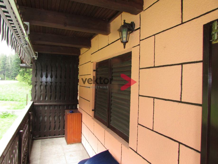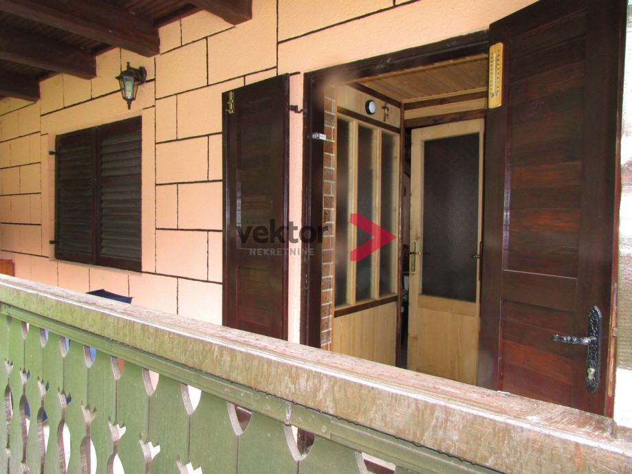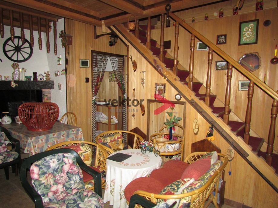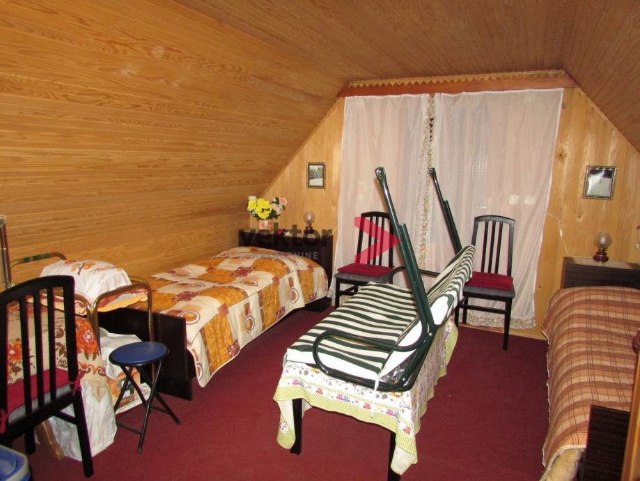 Prizemlje i visoko potkrovlje ukupne površine 72m2, s tim da je u prizemlju dnevni dio u kojem se nalazi kamin i peć na drva, mala odvojena kuhinja, prostrana kupaona i špajza. Iz prizemlja se izlazi na natkrivenu terasu. Unutarnje stepenice vode u visoko potkrovlje gdje se nalaze dvije sobe, od kojih jedna ima izlaz na balkon.