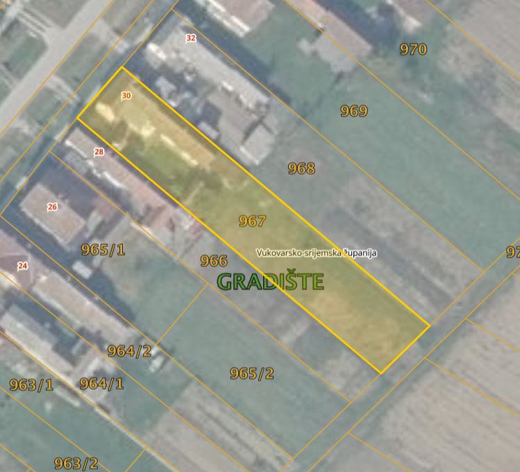 Prodaje se prizemnica, dvorište i oranica ukupne površine 1.259 m2 na adresi Nova ulica 30 u naselju Gradište. Prizemnica je potpuno obnovljena 2006. godine, redovito je održavana te se nalazi u građevinski dobrom stanju. U zgradi je izveden rasplet elektroinstalacije, vodovododa i kanalizacije.