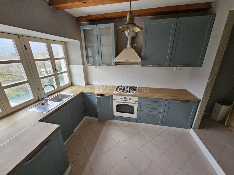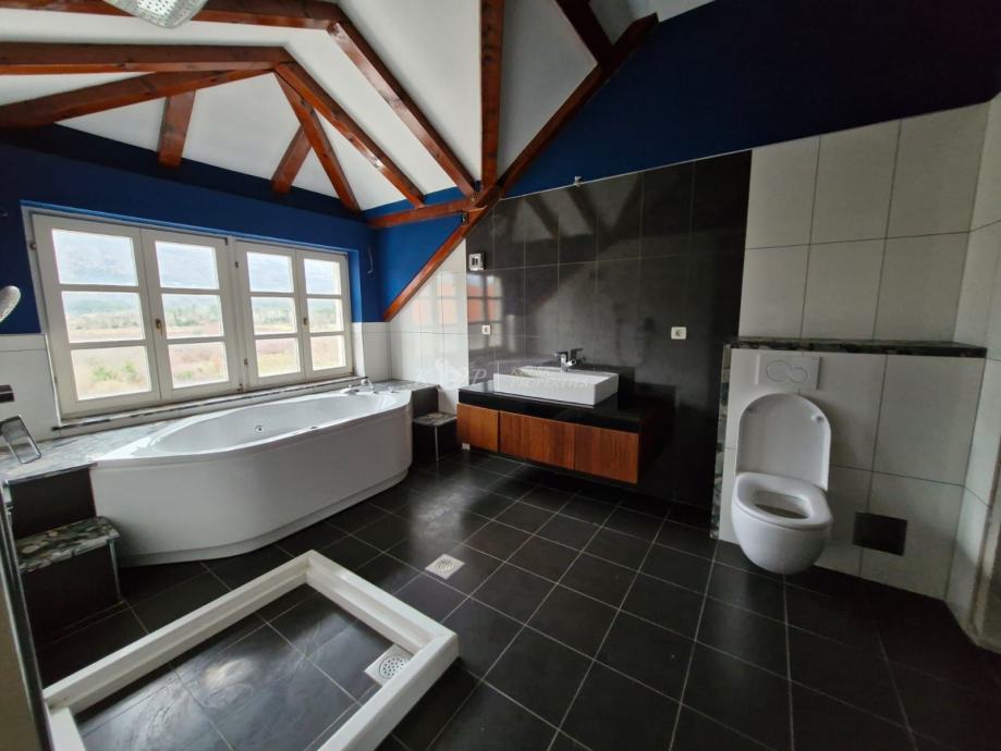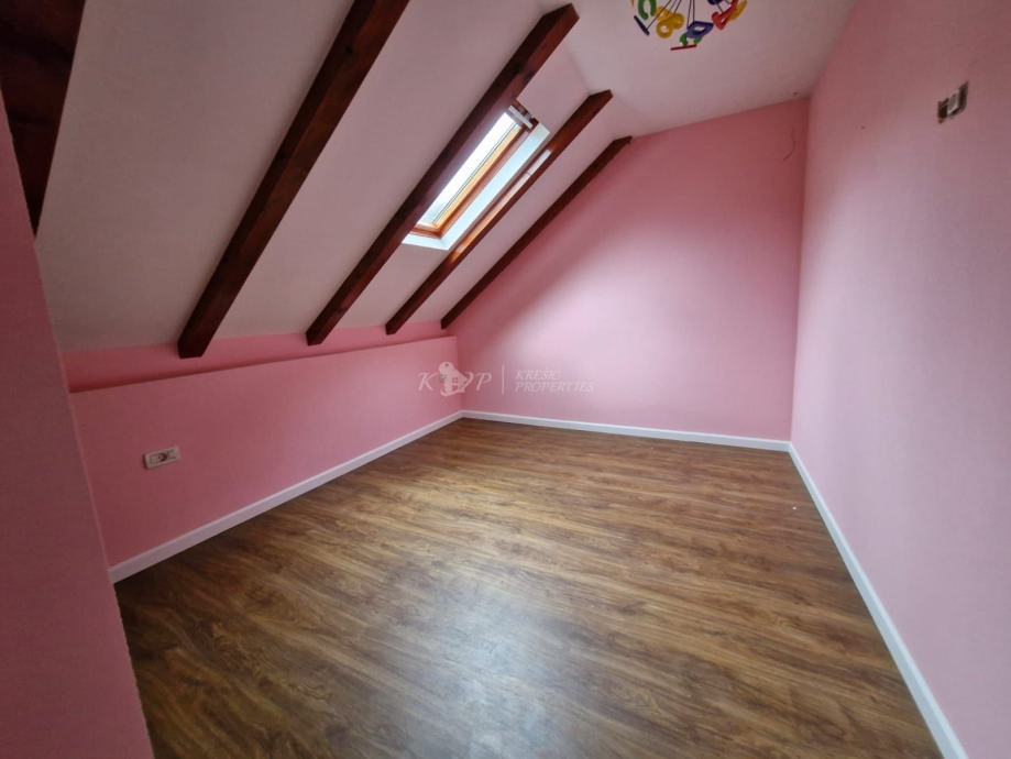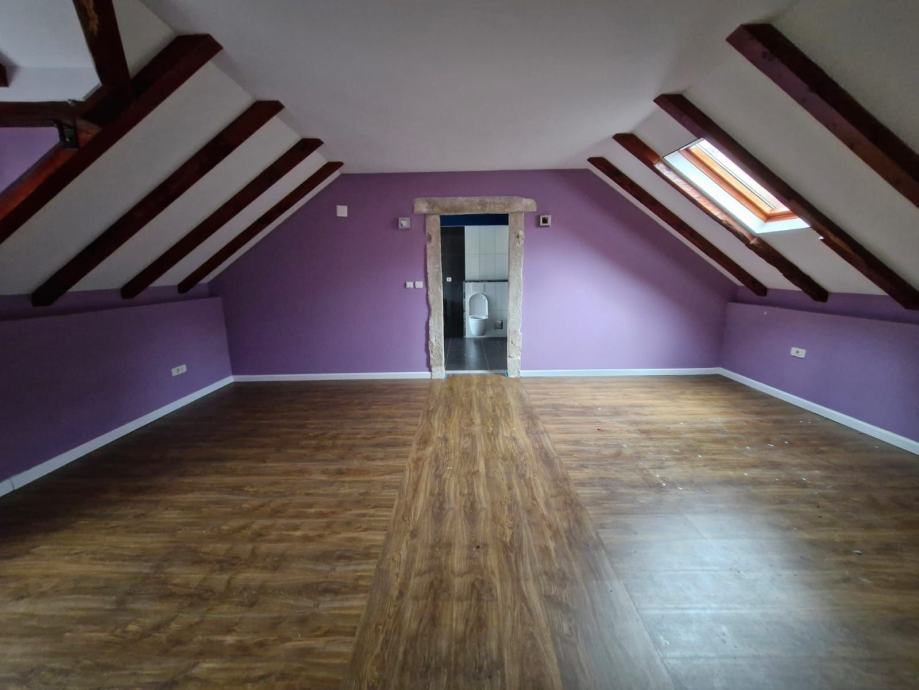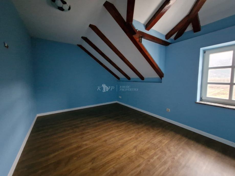 Na prvom katu površine od 80m2 se nalazi dnevni boravak, kuhinja s ostavom, blagovaonica, kupaonica i pomoćna prostorija. Unutarnjim stubištem dolazi se do visokog potkrovlja površine 66m2 u kojem se nalazi hodnik,ostava i tri spavaće sobe od kojih je jedna većih dimenzija s vlastitom kupaonicom.