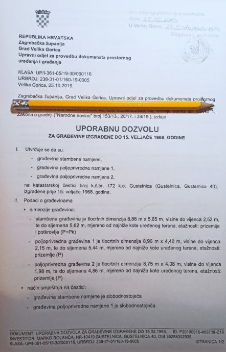 Vlasnik 1/1 svi papiri čisti. Objekti posjeduju potvrdu nadležnog katastarskog ureda da su građeni i ucrtani prije 1968 godine i kao takvi građevnu i uporabnu dozvolu.
