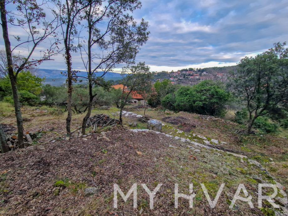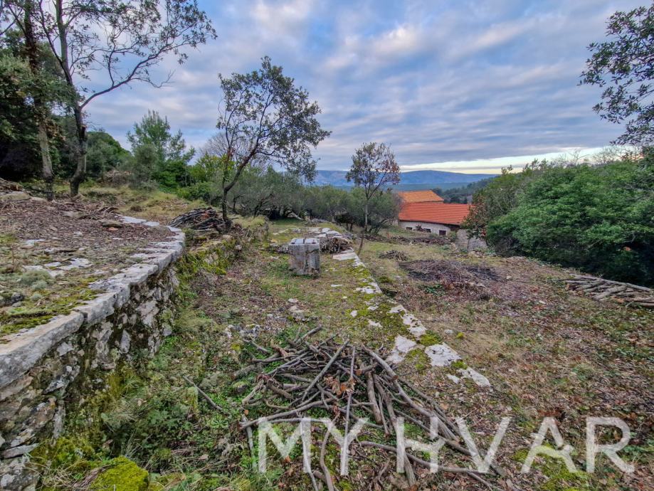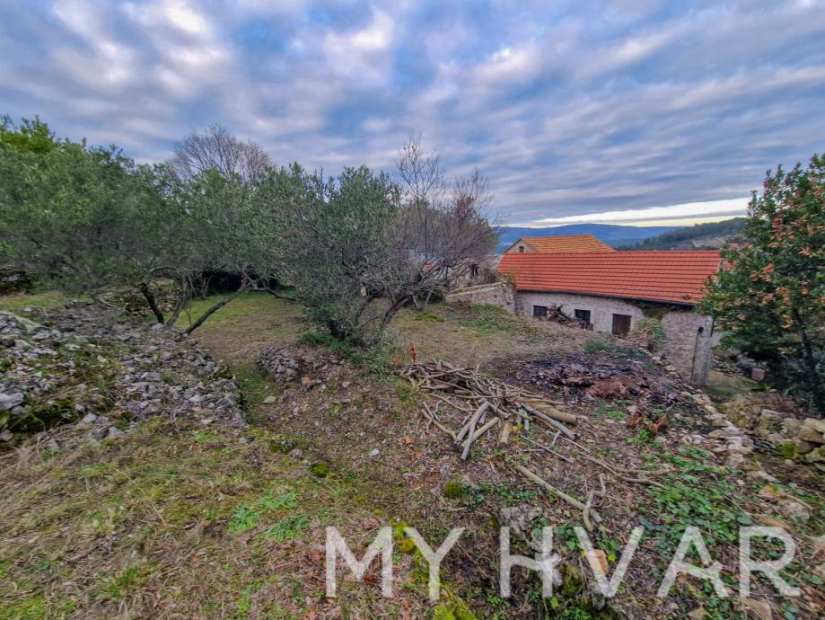 Na dvorište se nadovezuje 900 m2 građevinskog zemljišta ,oćišcenog terena, sa cisternom za vodu sa gornje strane i pogledom na otok Brač.