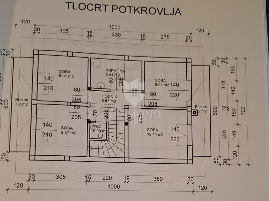 U prizemlju se nalazi prostrani dnevni boravak povezan s kuhinjom i blagovaonicom u open space konceptu, veliki hodnik, opremljena kupaonica i ostava. Iz dnevnog boravka izlazi se na prostranu terasu s koje se pruža ugodan pogled na okolinu. Na katu su smještene četiri spavaće sobe, kupaonica i dodatni manji WC. Sve četiri spavaće sobe imaju izlaz na balkon što im daje puno svijetla i osjećaja topline.