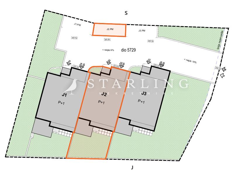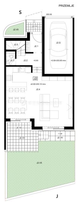 PRIZEMLJE S VRTOM sastoji se od dnevnog boravak i blagovaonice, kuhinje, wc-a, ulaznog prostora, pretprostora, loggie, natkrivene terase i garaže.