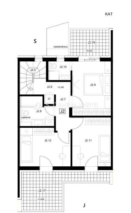 KAT se sastoji od tri spavaće sobe, dvije kupaonice i dvije terase.