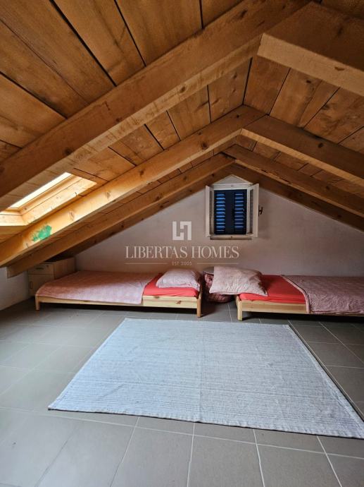 U prizemlju se nalaze spavaća soba i velika kupaonica. Dolaskom na prvi kat, s jedne strane nalazi se kuhinja opremljena svim potrebnim uređajima, s druge strane je spavaća soba, a u produžetku se nalazi izlaz na prostrani balkon koji omogućuje uživanje u prekrasnom pogledu dok pijete jutarnju kavu ili večernji koktel. U potkrovlju se nalazi dječja soba koja pruža privatnost i udobnost.