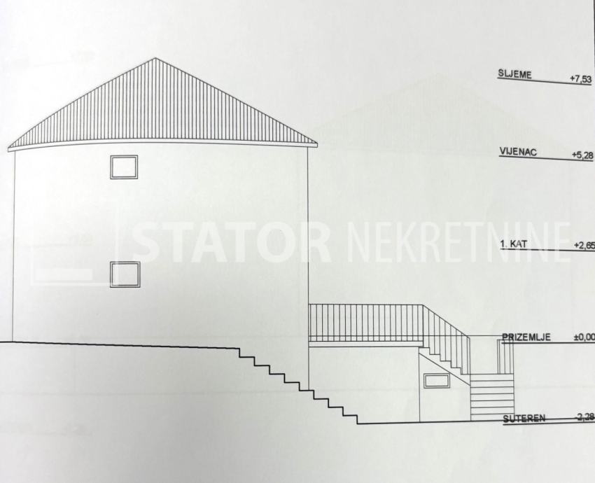 JELSA, prodaje se kuća površine 210m2 (sa uračunatim koeficijentom). Sastoji se od suterena u kojem je stambeni prostor površine 50,82m2, prizemlja stambenog prostora 72,64m2, natkrivene terase površine 40,71m2 i otvorenog stubišta 5,76m2. Gornja etaža također ima 72,64m2 stambene površine. U suterenu su dvije sobe, kuhinja, kupaonica i ulazni prostor. U jednom dijelu je i WC. Prizemlje kuće sastoji se od dnevnog boravka, dvije spavaće sobe, kuhinje sa blagovaonicom, kupaonice, ostave, hodnika i prostrane, natkrivene terase. Otvorenim stubištem ide se na gornju etažu na kojoj se nalaze četiri spavaće sobe, kupaonica sa WC – om i hodnik. Kuća ima dvorište sa vrtom površine 176m2 koje je uredno održavano. Sva pročelja su uredno obrađena žbukom dok je suteren obložen kamenom. Prozori su ostavljeni izvorno, drveni sa griljama za zaštitu od sunca. Do centra je 5 minuta hodom i do same plaže dvije minute. U neopsrednoj blizini su marketi, tržnica, restorani…
