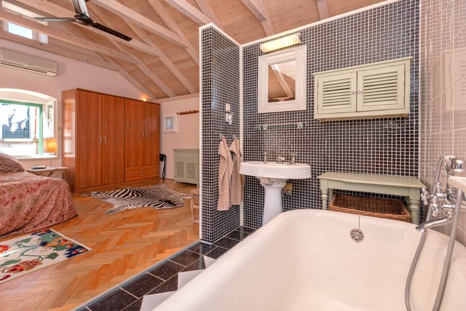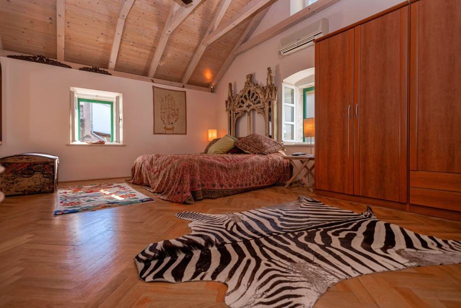 Kamena kuća u starom dijelu Jelse na Hvaru, udaljena 3 minute šetnje od mora. Sastoji se od : studio apartmana s dvorištem u prizemlju, kuhinje s dnevnim boravkom i prostranom terasom na katu i velike spavaće sobe s kupaonicom u potkrovlju. Kuća je udobna za život i atraktivna za najam. Obilje vanjskog prostora i unutarnji dizajn, čine je posebno privlačnom.