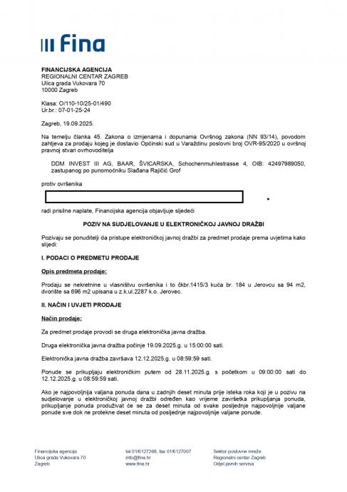 Elektronička javna dražba završava 12.12.2025.g. u 14:59:59 sati.