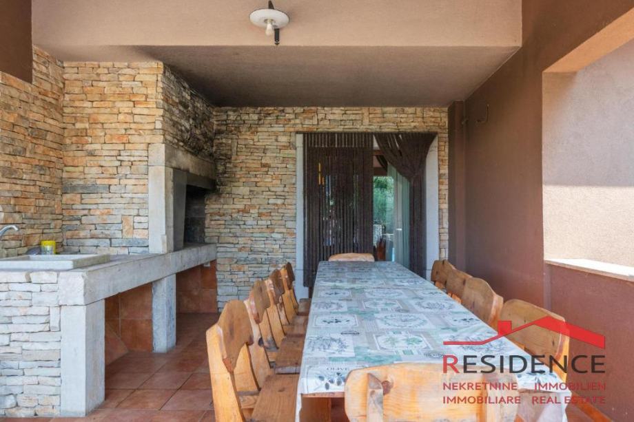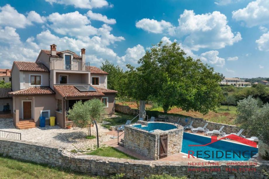 Wir verkaufen eine freistehende Villa mit Pool in der Nähe von Svetvičent. Gesamtfläche 240 m2. Hof 599 m2. Im Erdgeschoss gibt es eine Küche mit Esszimmer, ein Wohnzimmer und ein Schlafzimmer mit Bad und separater Toilette. Vom Wohnzimmer aus gelangt man auf eine überdachte Terrasse mit Grill. Im ersten Stock befinden sich drei Schlafzimmer mit jeweils eigenem Bad. Eines der Schlafzimmer verfügt über eine Terrasse. Im Dachgeschoss gibt es ein weiteres Schlafzimmer mit Bad und Terrasse Alle Zimmer sind klimatisiert. Im Wohnzimmer ist eine Fußbodenheizung vorhanden, in den Zimmern sind Heizkörper installiert. Sie müssen lediglich einen Pellet- oder Holzofen kaufen und die Anlage anschließen. Solarkraftwerk. Energieklasse B. Überdachter Parkplatz für Autos und Platz für Fahrräder. Der Pool ist 45 m2 groß und hat eine spezielle Form und istrischen Kažun. Keller von 19 m2.
