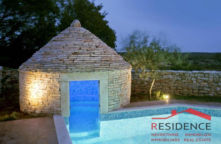 Bazen je površine 45 m2 sa specifičnim oblikom i Istarskim kažunom. Podrum od 19 m2.