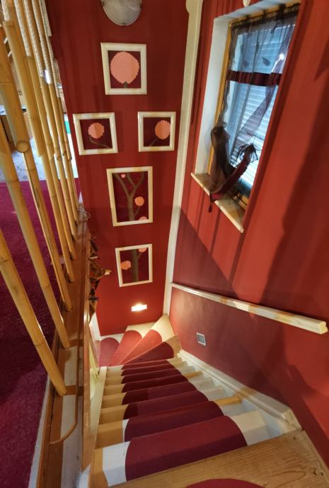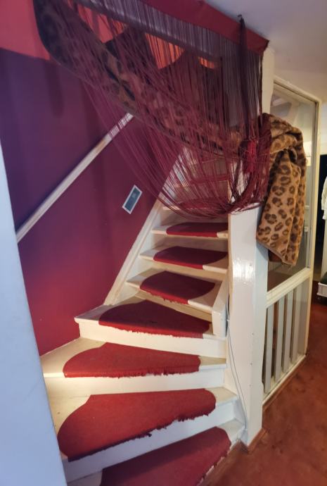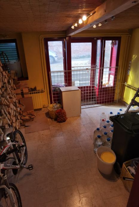 - prizemlje (poslovni dio 94m2): hodnik, wc, jedna manja prostorija, jedna veća prostorija koja ima ulaz/izlaz sa zadnje strane i izlog, 2 prostorije ispod stepeništa i stepenice koje vode na kat.(ured, advokatska kancelarija ili javni bilježnik, zubarska ordinacija)