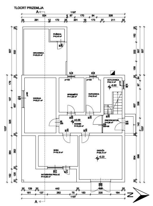 PRIZEMLJE: ulazi se u pretprostor sa kotlovnicom (ispod stepeništa), hodnik, kupaona i WC, spremište, kuhinja sa blagovaonicom, dnevni i garaža.