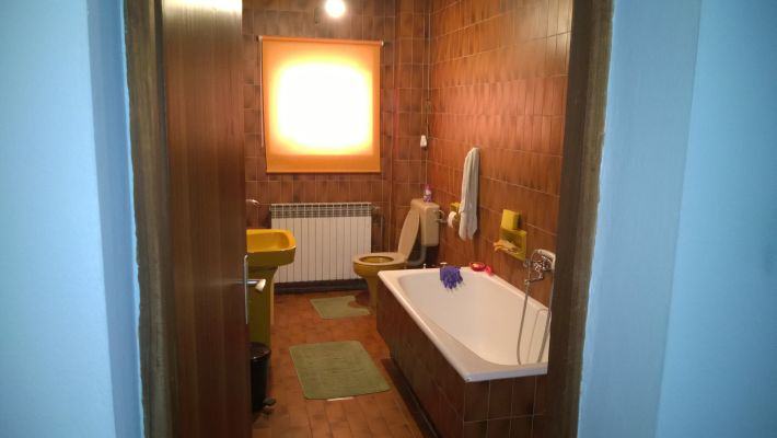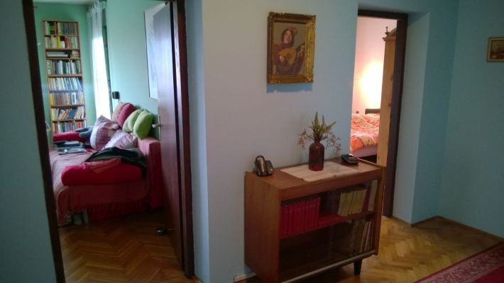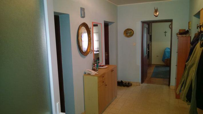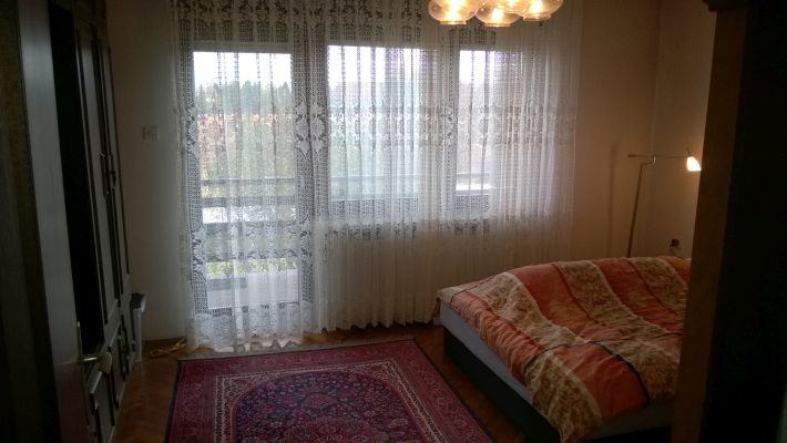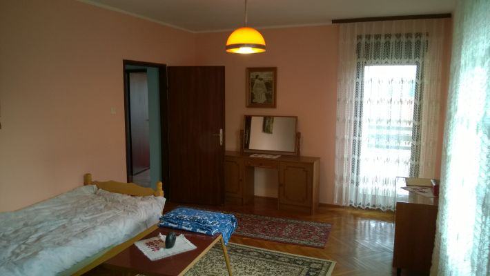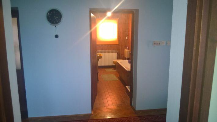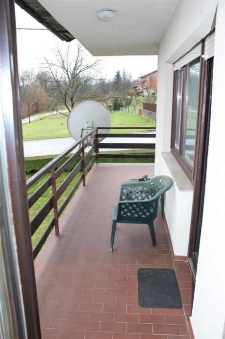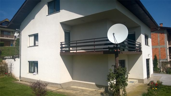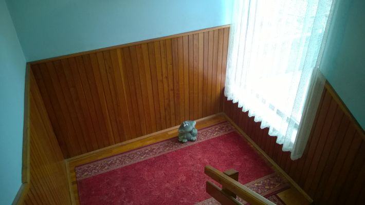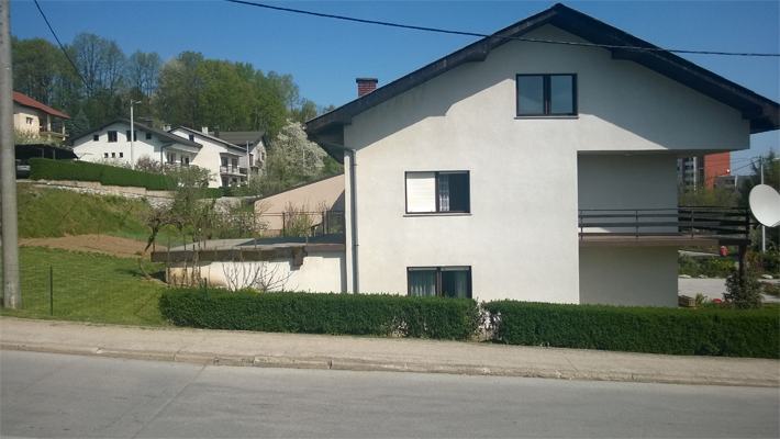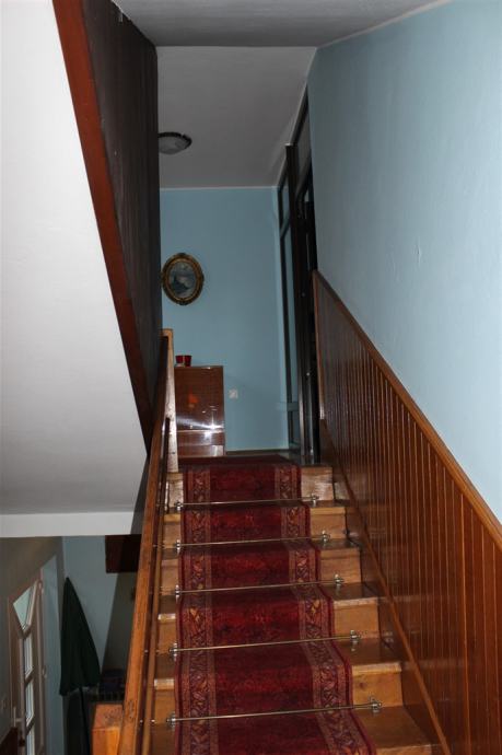 KAT: drvene hrastove stepenice vode na kat, ulazi se u pretprostor, hodnik, dvije spavaće sobe sa izlaskom na balkon, dnevni boravak sa izlaskom na balkon i jedna soba (predviđena za kuhinju) sa izlaskom na terasu (8,5 m2) i kupaona (kada i tuš) i WC.
