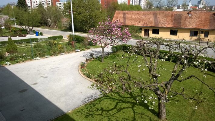Gradska kanalizacija, voda, struja, telefon. Dio dvorišta je asvaltirano, a ostalo je zelena površina. Iza kuće je drvarnica i spremište, a iznad toga se nalazi terasa.