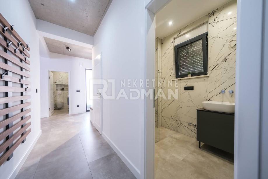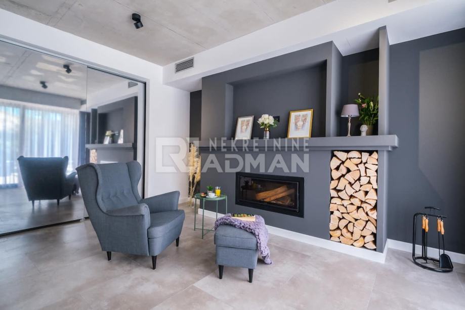 Budući da se radi o vili novije gradnje (2020g.)posebno se vodilo računa o detaljima. Linije su jasne, a dominantni materijali su staklo, drvo i čelik. Klima-uređaj nalazi se u svim prostorijama.