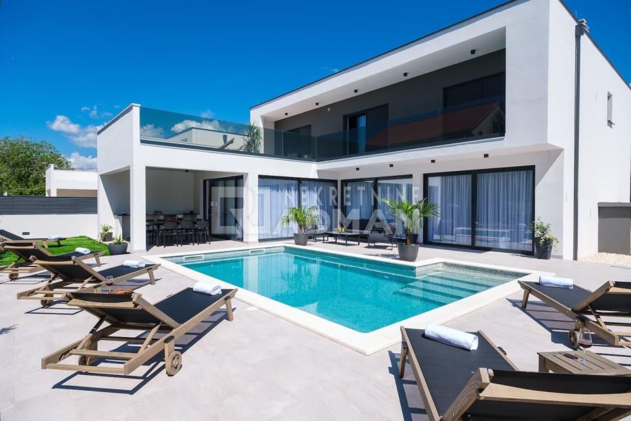 Ova vila smjestila se na površini od 600m2 a prostire se na dvije etaže. U prizemlju se nalazi praonica, kupaonica, vrhunski opremljena prostorija za fitnes, prostorija za biljar, ostava i dvije spreme, prostrani dnevni boravak s TV prostorom i kaminom, luksuzna i kompletno opremljena kuhinja i blagovaona a sve s izlazom na veliku terasu i bazen(grijani), dok se na prvom katu do kojeg vode unutarnje stepenice nalazi 5 spavaćih soba, 4 kupatila i velika natkrivena terasa.