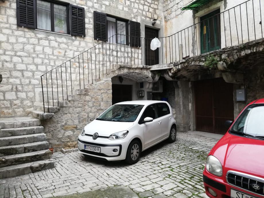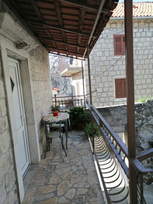 Na prvi kat se dolazi kroz stari kultni kameni dvor (s jednim parking mjestom od cca 35 m2) kružnim skalama i balaturom. Tu se nalazi jednosobni stan od istih 50 m2, također potpuno opremljen. Posjeduje jedno kupatilo, a velika soba se po potrebi lako može pretvoriti u dvije. Na balaturi od 10 m2 sa sjeverne strane u hladovini je poseban užitak pročitati novine i popiti kavu.