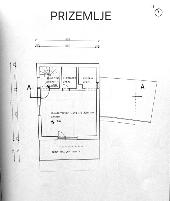 Prizemlje se sastoji od ulaznog hodnika, open space dnevnog boravka, blagovaonice i kuhinje, kupaone i velike terase s prekrasnim otvorenim pogledom na jug.