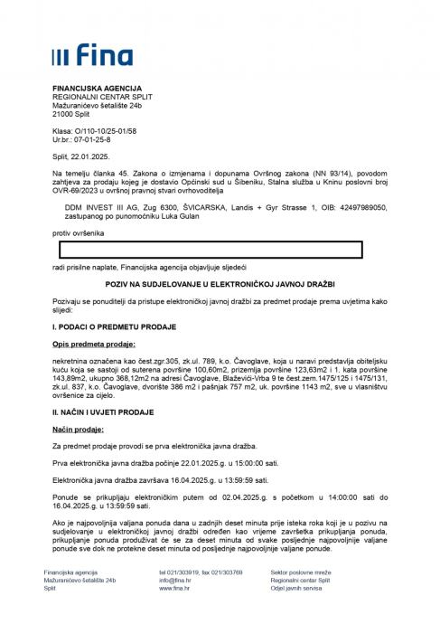 Prva elektronička javna dražba počinje 22.01.2025.g. u 15:00:00 sati.