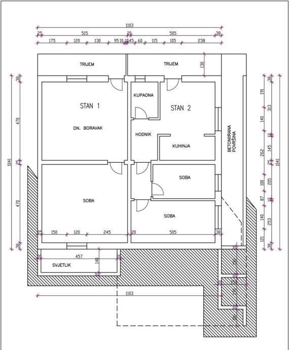 Nezavršena kuća tlocrtne površine 115 m2 u centru Knina, Krambergerova ulica. Projektirana kao stambeni objekt s 4 zasebna stambena prostora (stana): prizemlje, kat s posebnim ulazom i 2 stana u suterenu. Useljivo prizemlje i jedan stan u suterenu. Dostupna projektna dokumentacija, građevinska dozvola. Uređeno vlasništvo, bez tereta.