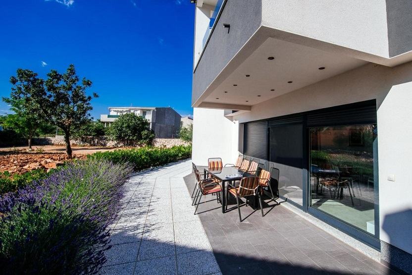 U prizemlju se nalazi jedan jednosoban apartman i jedan dvosoban apartman, s prostranim terasama.