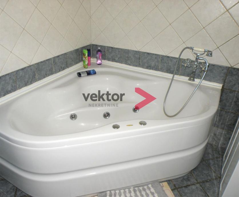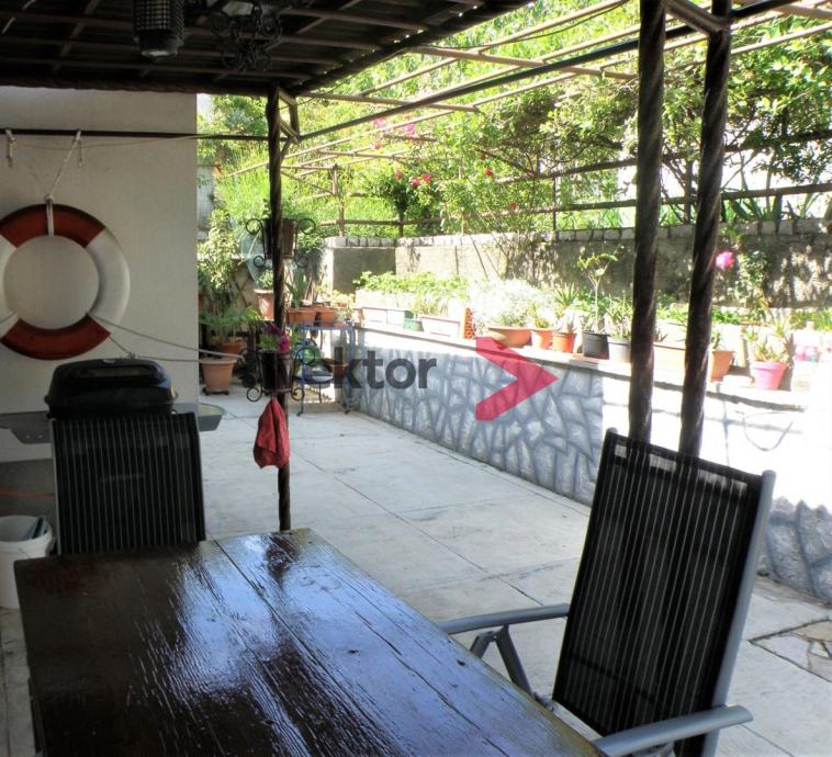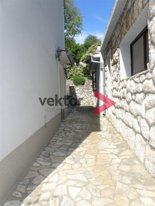 Na uređenoj okućnici nalaze se dvije terase, od kojih ona sa stražnje strane kuće natkrivena, a tu se nalazi još i ljetna kuhinja, sa kupaonom i spremište. U cijeni je i garaža površine 20m2.
