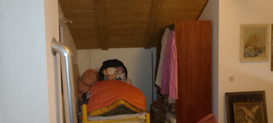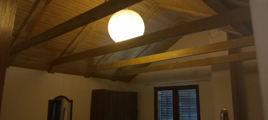Gornji kat 35m2 - otvoreni prostor te se vide visoke grede krovista te kupaona sa WC-om i kadom, znaci dolje je tus kabina, gore kada. Jako lijepi pogled sa gornjeg kata pogotovo te je on u razini parkinga auta.