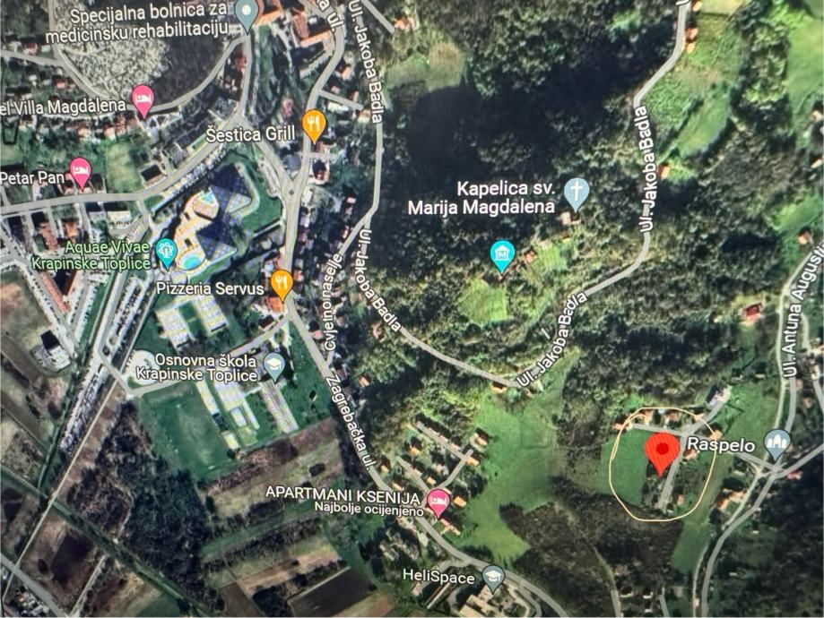 Građevinsko zemljište 518 m2 idealnih proporcija na odličnoj lokaciji u Krapinskim toplicama. Zemljište je u slijepoj ulici gdje je promet dozvoljen, no istom prolazi samo vlasnik susjedne kuće (na fotografiji s bazenom). Udaljeno par minuta od termalnog vodenog parka Aqua Vivae. Bespravni objekt izgrađen je u dozvoljenim gabaritima (više od tri metra od međe), no nije legaliziran zbog nezainteresiranosti tadašnjih vlasnika. Struja, voda i septička jama spojeni u objektu. Kvalitetna betonska deka, serklaži te gradnja od opeke. Ponuda arhitektonskog studija za ishodovanje građevinske dozvole je cca 4.500,00 eura. Istu nismo ishodovali iz razloga što će novi vlasnik ucrtati prema svojoj želji garažu, bazen ili sl.