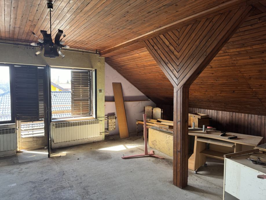 Na prodaju je kuća koja se sastoji od suterena u kojem je garaža i tri prostorije. Visoko prizemlje sastoji se od trosobnog stana koji je povezan sa potkrovljem.