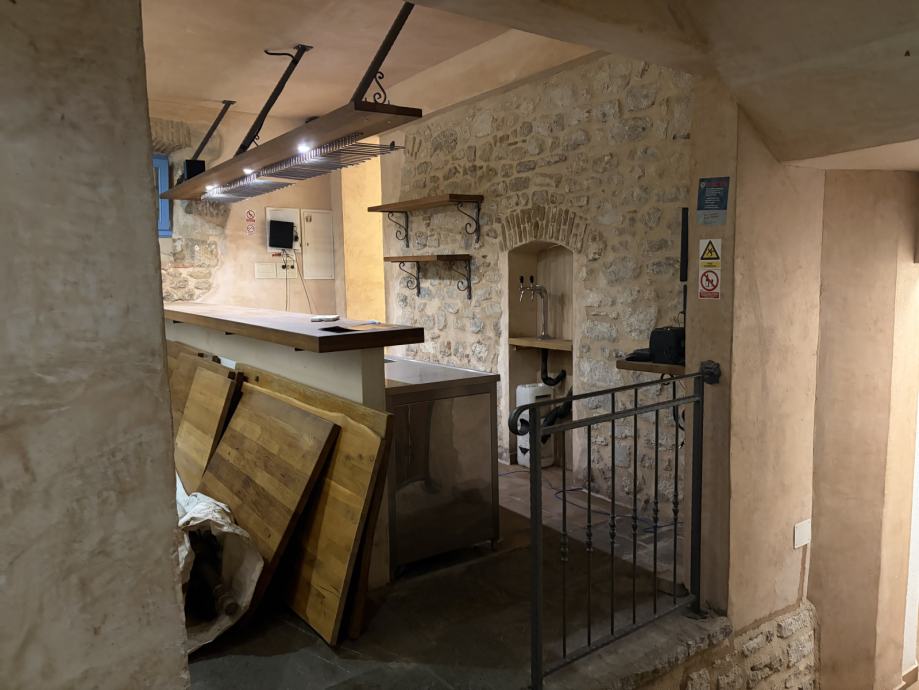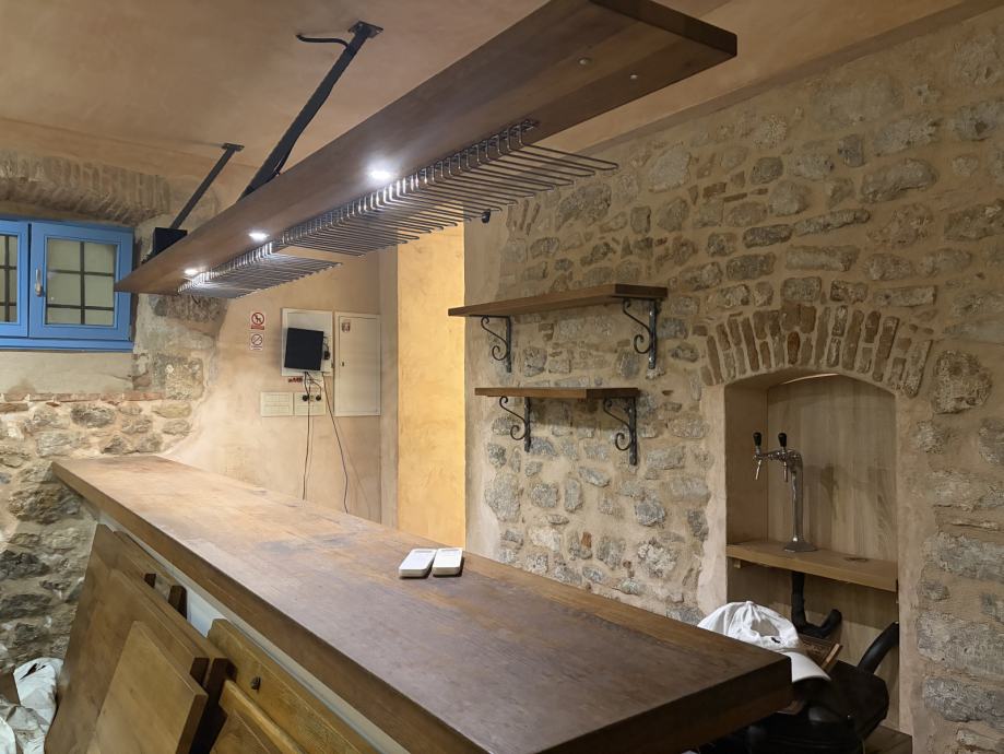 U prizemlju se nalazi ugodno uređeni prostor za goste s prekrasno uređenim šankom i sjedećim mjestima oko njega, što stvara intimnu i živu atmosferu idealnu za večernja druženja. Ispred restorana nalazi se terasa na platou, koja predstavlja dodatni kapacitet za goste i savršeno mjesto za uživanje u ambijentu staroga grada.