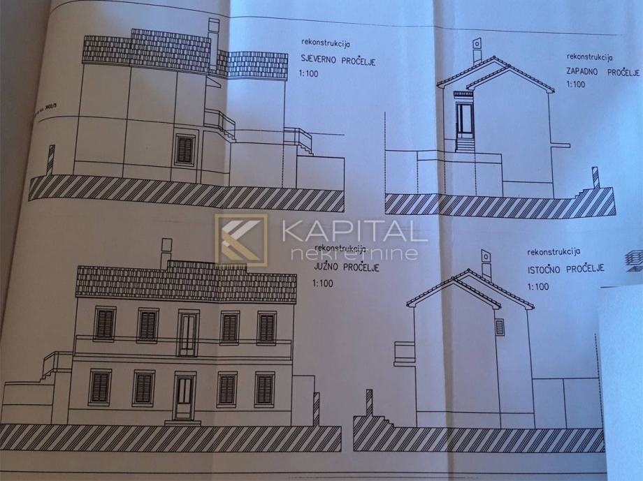 Samostojeća kuća P+1, 150 m2 + pom.obj. 23,86 m2, dvorište, vrt, parkirno mjesto, gradska kanalizacija i plin. Prizemlje čini stan 2s+db, centralno grijanje, klima, izlaz na dvorište i vrt. Vrlo lijep i održavan dio objekta. Kat kuće je roh bau s pogledom na more, plaćenim komunalijama i priključkom za struju i vodu. Nekretnina vrijedna pozornosti radi izuzetno dobre lokacije.