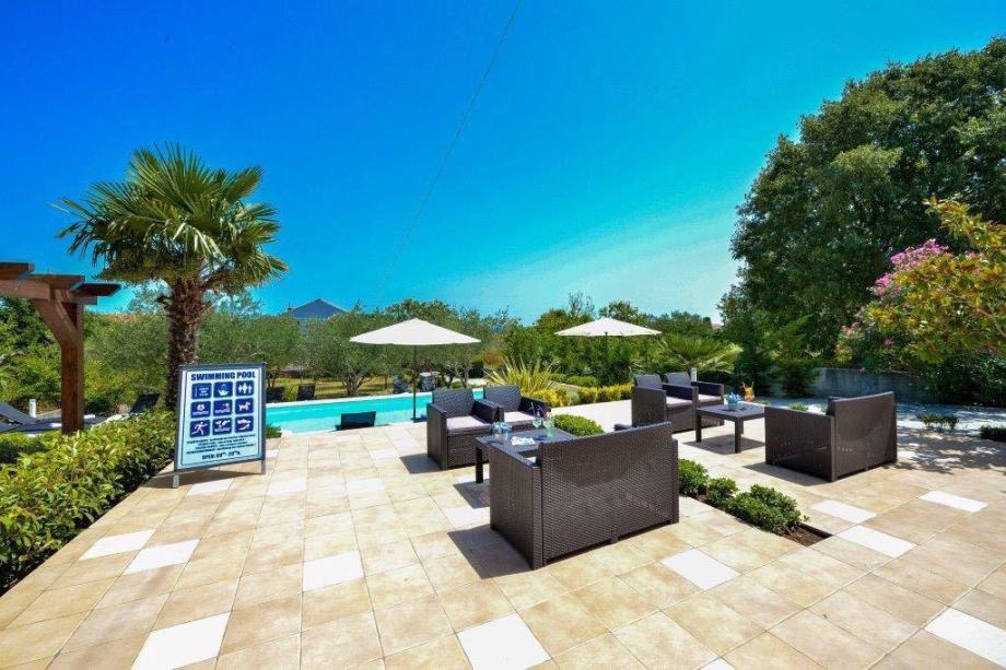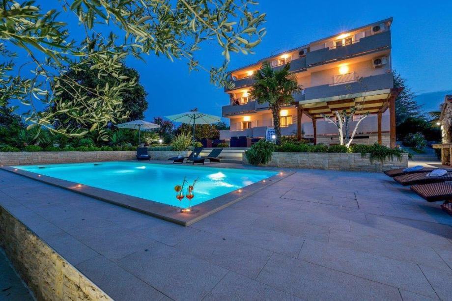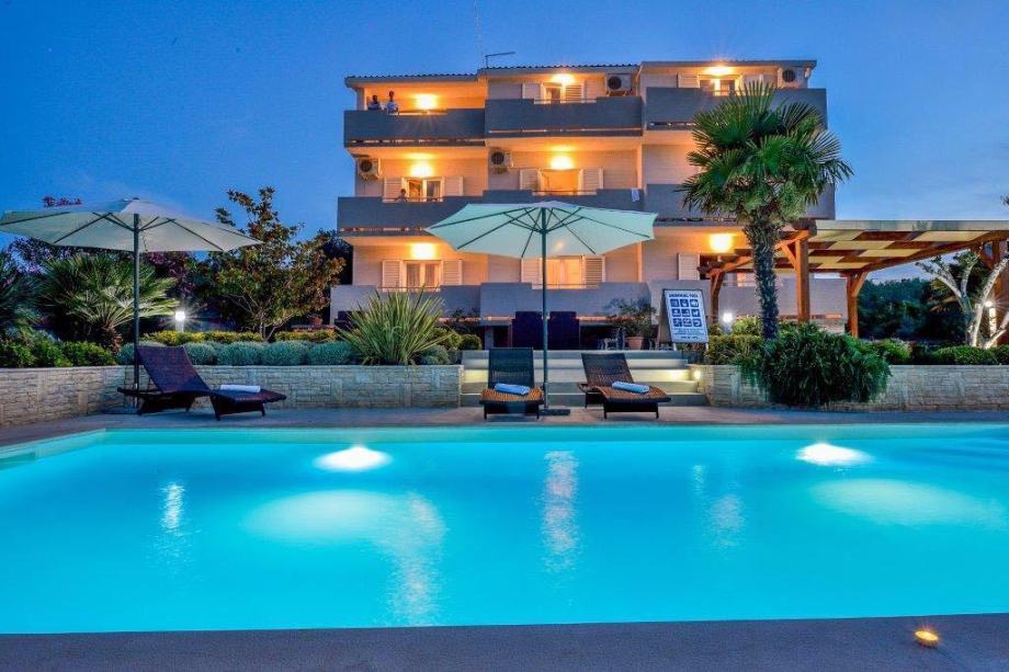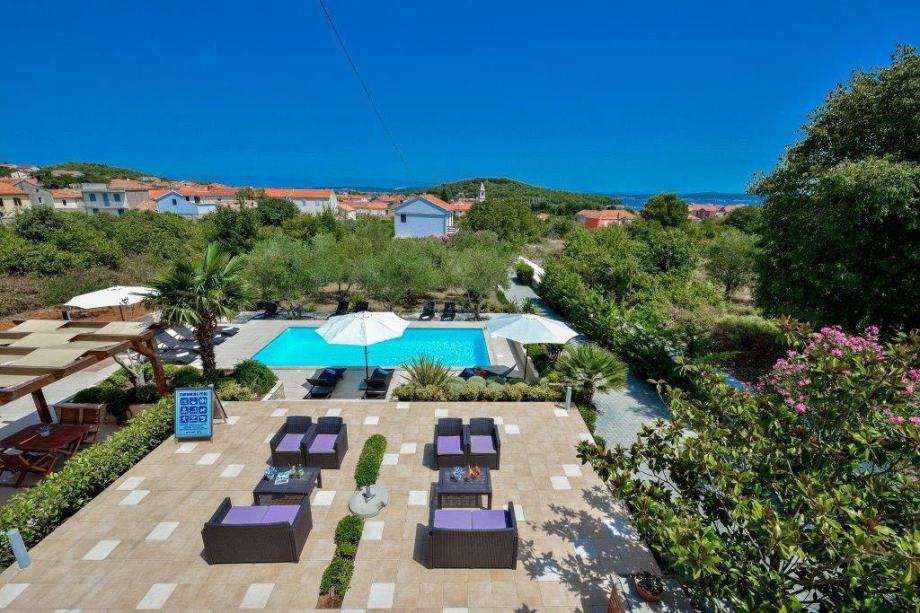 Prodaje se Vila s osam stanova i bazenom od 40m2 na prekrasnoj lokaciji u Kukljici. Stambena površina je 594 m2 i izgrađena je na parceli od 1771 m2. Vrt je vrlo lijepo uređen. Udaljenost od mora i plaže je 380 m. Nekretnina ima podrum, prizemlje, prvi i drugi kat. Sastoji se od četiri jednosobna i tri dvosobna apartamana, te jednog većeg dvosobnog stana na drugom katu. Ispred kuće nalazi se parking za više od 10 automobila, U vrtu se nalazi bazen, kamin sa vanjskim natkrivenim stolom i dječje igralište. Kuća ima uhodan posao iznajmljivanja u turizmu. Nekretnina se prodaje potpuno namještena i opremljena.