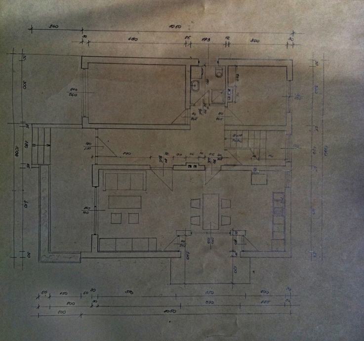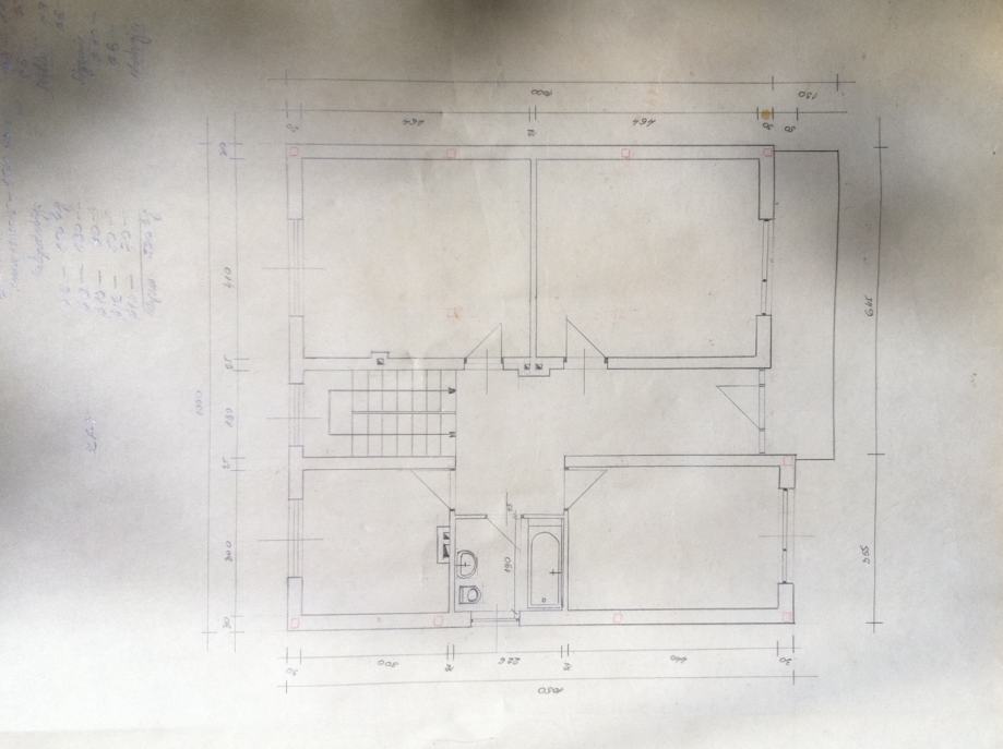 1. Kat: 4 spavaće sobe, hodnik, robau kupaona i klasične stepenice koje vode na tavan (robau).