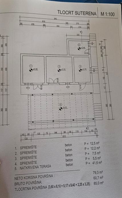 - prizemlja/suteren (79,3m2 neto korisna površina) gdje se nalazi vinski podrum, dva prostrana spremišta prekrasna velika natkrivena terasa