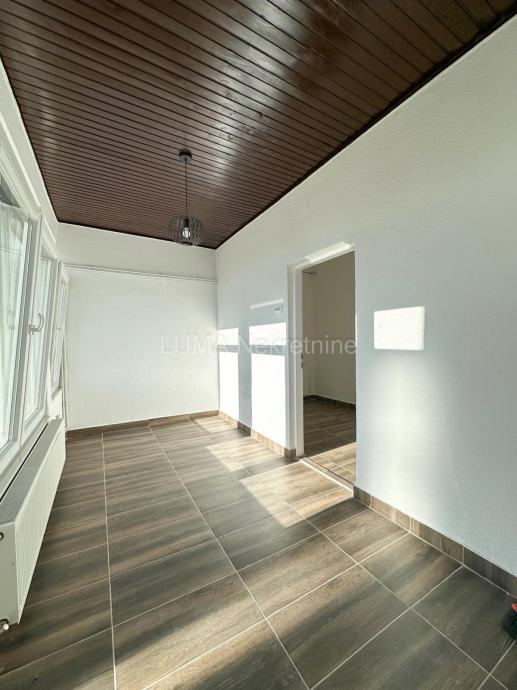 Sastoji se od 3 sobe, kuhinje s blagovaonom, sanitarnog čvora s kadom, hodnika te zimskog vrta. U prostranom dvorištu nalaze se garaža i spremište/pomoćna dvorišna prostorija.