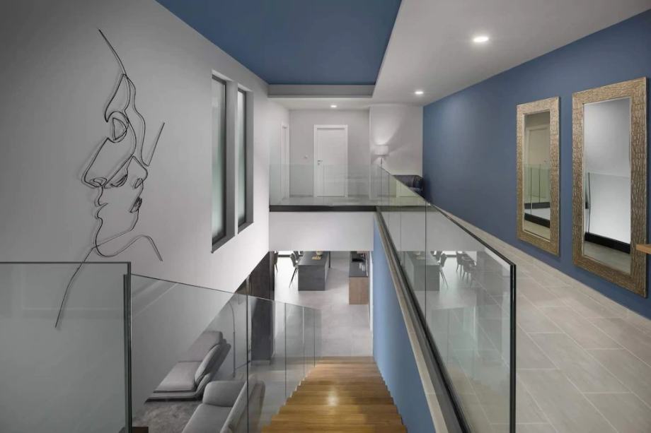 Unutarnje stepenište vodi na kat gdje se nalaze 4 spavaće sobe sa svojim kupatilima i garderobama.