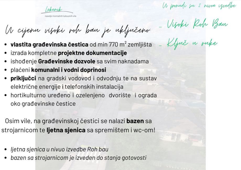 Vile su projektirane prema najvišim standardima ekološke održivosti, s mogućnošću ugradnje toplinske dizalice zrak-voda i klima uređaja. S energetskim certifikatom A+, jamčimo minimalnu potrošnju energije i maksimalnu udobnost za naše buduće vlasnike. Ove luksuzne vile pružaju udobnost i eleganciju u svakom detalju, s visokim standardom gradnje koji osigurava značajnu uštedu energije i minimalne režijske troškove. Za vašu potpunu udobnost, nudimo mogućnost ključ u ruke prema vašim željama i potrebama.