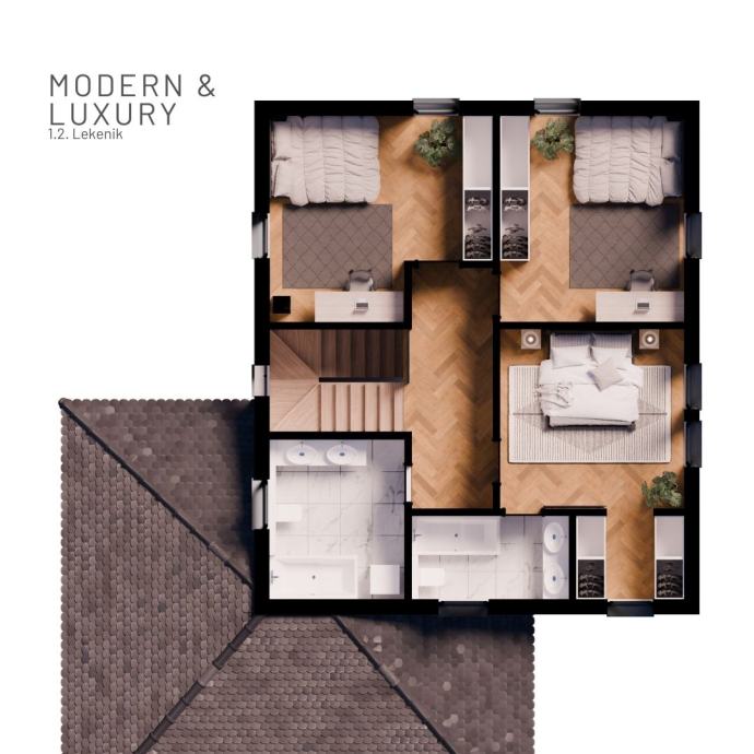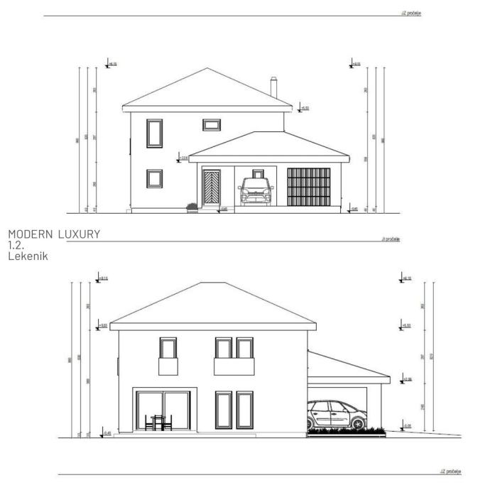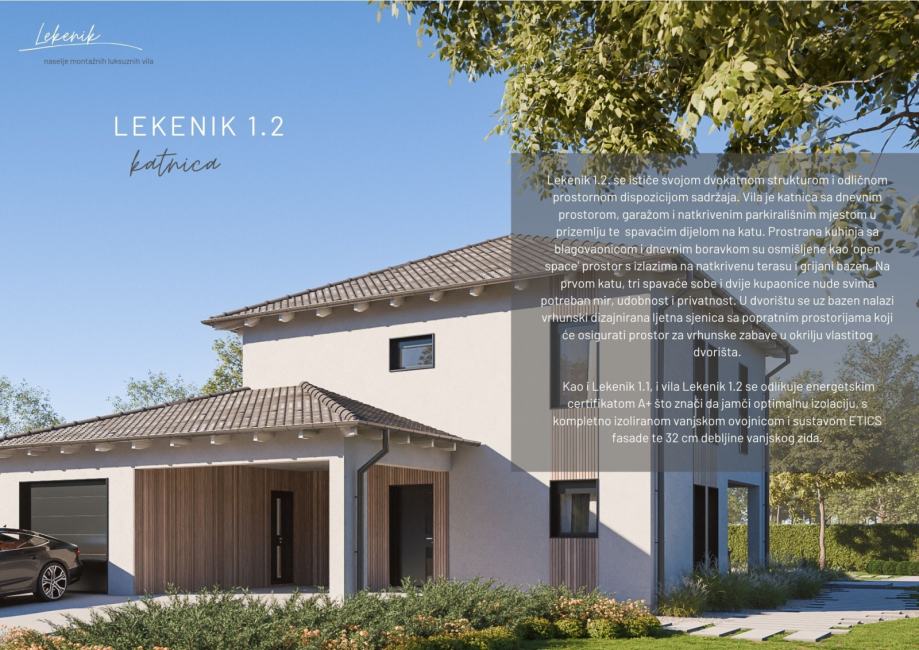 Lekenik 1.2. se ističe svojom dvokatnom strukturom i odličnom prostornom dispozicijom sadržaja. Vila je katnica sa dnevnim prostorom, garažom i natkrivenim parkirališnim mjestom u prizemlju te spavaćim djelom na katu. Prostrana kuhinja sa blagavaonicom i dnevnim boravkom su osmišljene kao open space prostor s izlazima na natkrivenu terasu i grijani bazen. Na prvom katu, tri spavaće sobe i dvije kupaonice nude svima potreban mir, udobnost i privatnost. U dvorištu se uz bazen nalazi vrhunski dizajnirana ljetna sjenica sa popratnim prostorijama koji će osigurati prostor za vrhunske zabave u okrilju vlastitog dvorišta.